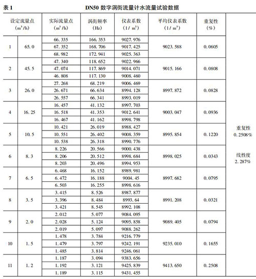 將本文實現(xiàn)的數(shù)字煙氣流量計在上述 50mm 口 徑( 簡稱 DN50) 的水流量試驗裝置上進行試驗。先在其正常流量范圍內(nèi)進行試驗,流量從大到小逐漸降低,之后不斷探求其所能測量的*小流量。每個流量點試驗三次,計算其重復(fù)性、平均儀表系數(shù)和線性度。水流量試驗數(shù)據(jù)如表 1 所示。
