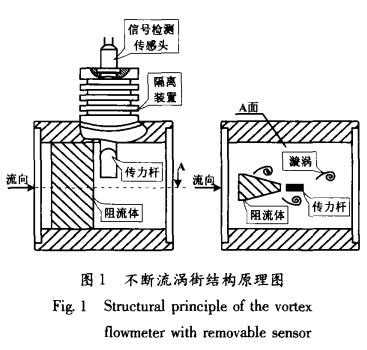 不斷流渦街同樣是以卡門渦街原理為依據(jù)測量流體流速的,但不斷流渦街表體已經(jīng)在結(jié)構(gòu)上有了質(zhì)的改變。如圖1所示,它將普通渦街單一的信號檢測傳感頭改變?yōu)閭髁U與信號檢測傳感頭兩部分,并通過隔離裝置完全隔離。當表體中流過流體并產(chǎn)生漩渦時,由傳力桿檢測漩渦的變化,并以力的形式傳遞給信號檢測傳感頭,完成了力信號到電信號的轉(zhuǎn)換過程。雖然傳力桿與流體直接接觸,但其本身只是進行力傳輸?shù)母軛U,因此,只對外形尺寸及鋼材選擇上具有要求。而信號檢測傳感頭是通過隔離裝置與流體完全密閉隔離的,再加上隔離裝置本身具有的散熱功能,使得信號檢測傳感頭的使用溫度要遠遠低于流體的實際溫度,從而有效地提高了普通信號檢測傳感頭的可測介質(zhì)溫度。同時,不斷流渦街在進行維修更換信號檢測傳感頭時,并不影響工藝管道內(nèi)流體的流動,真正實現(xiàn)了信號檢測傳感頭的不斷流拆裝維護。