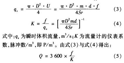 式中:m為漩渦發(fā)生體兩側(cè)弓形面積與管道橫截面面積之比;D為表體通徑,~;d為漩渦發(fā)生體迎面寬度,~;f為漩渦的發(fā)生頻率,Hz;U:為漩渦發(fā)生體兩側(cè)平均流速,耐s;sr為斯特勞哈爾數(shù);U為被測介質(zhì)來流的平均速度,耐s。管道內(nèi)體積流量q。為: