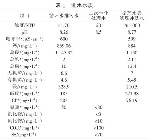 由表1可知,循環(huán)水排污水濁度較高,硬度大,主要是鈣鹽、鎂鹽含量較高;二次生化處理水是經(jīng)現(xiàn)有的生化處理系統(tǒng)處理后的氣化灰水、沖渣水等廢水,其氨氮、COD需進(jìn)一步去除,以利于后續(xù)脫鹽處理系統(tǒng)的運(yùn)行。