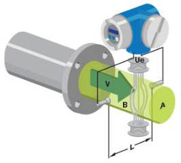 該電壓由安裝在管道式電磁流量計主體中的感應電極檢測,并發(fā)送到變送器,變送器根據(jù)管道尺寸計算體積流量。
