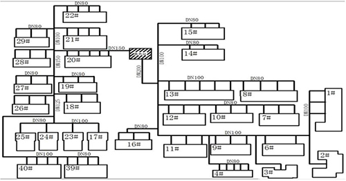 某小區(qū)住宅樓建設于1996年,建筑結(jié)構(gòu)為磚混建筑,建筑面積為54931m2,共30棟住宅樓。2017年繳費739戶,總采暖面積為47141m2。換熱站位于小區(qū)中部,板式換熱機組設計換熱面積為50000m2,循環(huán)泵額定功率為30kW,流量為200m³/h,揚程為32m。庭院管網(wǎng)共分為2個支狀供回水環(huán)路,該小區(qū)供熱管網(wǎng)見圖1所示。