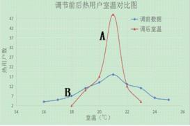 圖3中的曲線 A和B供熱管網(wǎng)智能蒸汽流量計調(diào)節(jié)前后的熱用戶室溫變化情況,橫坐標表示室溫分布,縱坐標表示熱用戶數(shù)量。從圖中可以看出,智能蒸汽流量計調(diào)節(jié)前熱用戶室溫比較分散,既有室溫小于18℃的熱用戶,也有室溫大于24℃的熱用戶。熱用戶室溫“近熱遠冷”,供熱管網(wǎng)存在水力不平衡現(xiàn)象。智能蒸汽流量計調(diào)節(jié)后,有49戶用戶室溫在20℃~21℃之間,從圖中可以看出室溫分布范圍縮小,平均室溫降低,從而,不僅減少了供熱量,也大大提高了供熱品質(zhì)。一般來講,對采暖系統(tǒng),每增加 1℃平均室溫,能耗增多 5%~10%。采暖系統(tǒng)實現(xiàn)平衡后,常常可以降低平均室溫1℃~3℃。