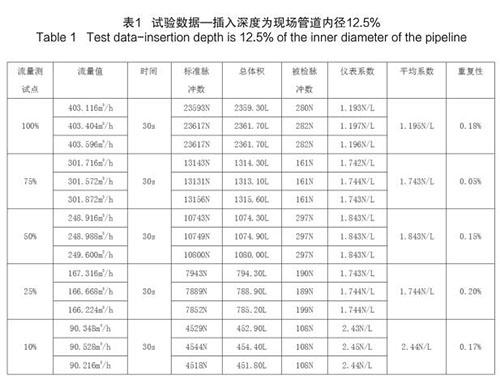 煙氣流量計(jì)插入深度為現(xiàn)場(chǎng)管道內(nèi)徑的 12.5%時(shí),試驗(yàn)數(shù)據(jù)如下(以 DN200 為例):