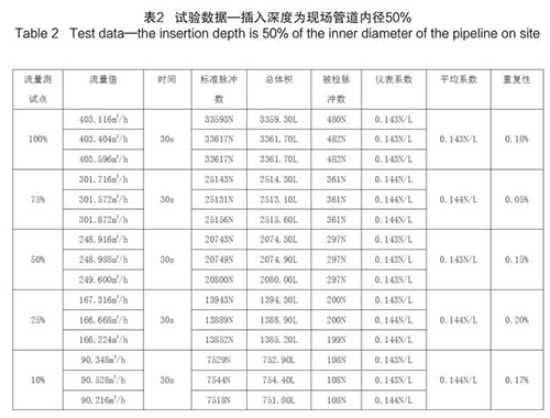 煙氣流量計(jì)插入深度為現(xiàn)場(chǎng)管道內(nèi)徑的50%時(shí),試驗(yàn)數(shù)據(jù)如下(以 DN200 為例):