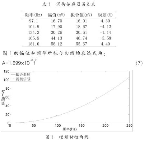 其中 K 1 為儀表系數(shù), D 為管道直徑。在管道口徑 D 不變,流體密度不變的情況下,渦街傳感器的輸出幅值與 f 2 成正比,具體表達形式可以根據(jù)實驗測出。本文以 50mm 口徑氣體實驗為例,數(shù)據(jù)如表 1 所示: