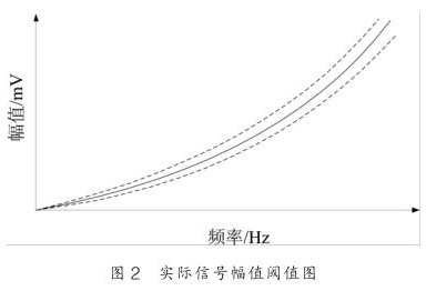 其中 c 為系數(shù), δ 為相對誤差限, 其示意圖如圖 2 所示,圖中實線為幅頻關(guān)系的理論擬合曲線, 而虛線為幅值波動的閾值曲線。根據(jù)實驗的數(shù)據(jù),渦街信號幅值波動的相對誤差為 ±10% 。