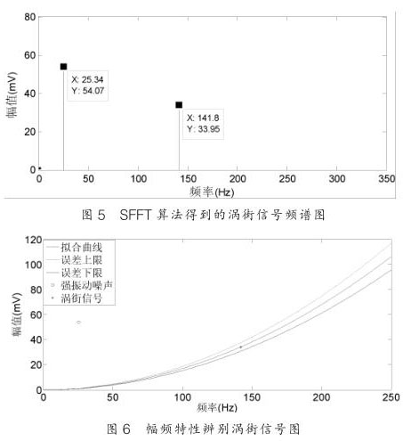 從圖 5 可以看出 SFT 算法能夠很好恢復(fù),對渦街信號的頻率恢復(fù)沒有誤差,而幅值的誤差不超過 1% ,這對含有強振動噪聲的渦街信號精確測量至關(guān)重要;圖 6 是經(jīng) SFT 頻譜分析所得到的數(shù)據(jù)通過幅頻特性曲線來辨別是噪聲信號還是渦街信號。通過幅頻關(guān)系的信號處理方法可以從含有振動的混合信號中識別渦街信號,從而達到提高液化氣流量計抗振動性能的目的。
