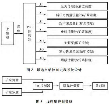 圖3中的礦漿流量與礦漿濃度分別由科氏質(zhì)量流量計(jì)和超聲波流量計(jì)測得,并 以4~20mA 電流信號傳送給 PLC控制器。由 PLC控制器根據(jù)電流信號值計(jì)算出實(shí)際的礦漿濃度和礦漿流量值,對上述兩個(gè)值進(jìn)行邏輯處理以及運(yùn)算,得出實(shí)時(shí)加藥量。PLC 控制器將計(jì)算出的實(shí)時(shí)加藥量數(shù)據(jù)以4~20mA 的電流信號發(fā)送給隔膜計(jì)量泵,由其控制并實(shí)現(xiàn)加藥量過程的自動(dòng)控制。