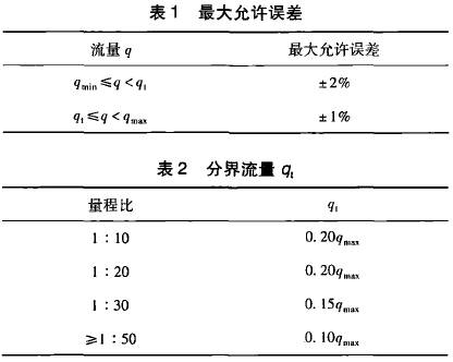 在GB21391--2008《用氣體渦輪流量計測量天然氣流量》對分界流量q,有明確的定義,即低于該流量要采用擴展誤差限的流量值。標準*5.2條從*大允許誤差和量程比兩方面對分界流量做出了規(guī)定,且明確了量程比是在*大允許誤差范圍內(nèi)流量計的*小流量和*大流量之比。該標準中對渦輪流量計要求的*大允許誤差如表1所示,量程比與分界流量q,的關系如表2所示。