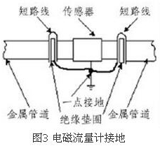 (4)盡量避開(kāi)振動(dòng)源、磁源(大功率電機(jī)、變壓器)由于dn200電磁流量計(jì)的測(cè)量感應(yīng)電壓很小,電壓較低,易受外界電磁噪聲的影響,故在安裝時(shí)應(yīng)進(jìn)行可靠的接地連(跨)接。金屬管道dn200電磁流量計(jì)接地連(跨)接方法如圖3所示
