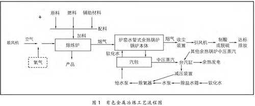 在有色金屬冶煉過程中,將原料、燃料和輔助材料根據熱平衡原理按一定比例進行配料,配料后的物料與空氣或高含氧的混合空氣在熔煉爐中進行氧化或還原反應,熔煉出有色金屬產品。同時,在熔煉過程中會產生大量的高溫煙氣( 1200 ℃ 左右),高溫煙氣經過余熱鍋爐時,與余熱鍋爐水側的軟化水進行熱量交換,煙溫迅速降至 250℃ 以下,再經收塵、制酸或脫硫裝置進一步收塵、降溫、凈化,*終達標排放。余熱鍋爐水側的軟化水經熱量交換后產生中壓飽和蒸汽(4 MPa 左右),送至余熱發(fā)電機組發(fā)電。具體的工藝流程如圖 1 所示。