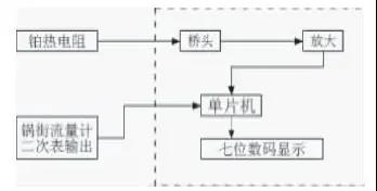 要想得到準(zhǔn)確的流量數(shù)據(jù),就必須不斷地在線(xiàn)檢測(cè)出運(yùn)行工況下的溫度,進(jìn)行溫度補(bǔ)償。安裝鍋街流量計(jì)的同時(shí)配套使用的DTB液流量計(jì)溫度補(bǔ)償器。DTB 液氨流量計(jì)溫度補(bǔ)償器安裝電原理方框圖(如圖1),其中虛線(xiàn)框內(nèi)為DTB溫度補(bǔ)償器部分。