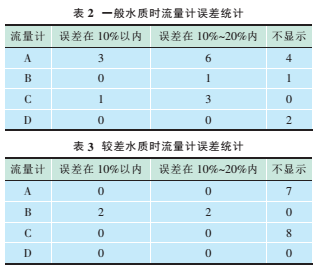 表1中,“—”表示超聲波流量計因接收信號差而不顯示累計流量,誤差>20%的超聲波流量計累計流量表示因接收信號質(zhì)量差導(dǎo)致的儀器測量錯誤。對表1中的數(shù)據(jù)進行分類處理,以便得到一般和較差水質(zhì)2種情況時4臺流量計的誤差統(tǒng)計。表2和表3分別為為一般和較差水質(zhì)時的流量計誤差統(tǒng)計。