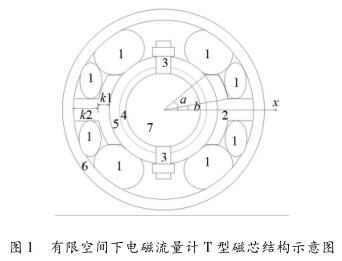 T型磁芯是為較小的空間下實(shí)現(xiàn)盡可能大的勵(lì)磁線圈而提出的,如圖1所示為較小空間結(jié)構(gòu)下,設(shè)計(jì)有T型磁芯的井水流量計(jì)傳感器截面圖。在圖中1表示線圈位置;2表示磁芯位置;3表示電極及其固定器件位置;4表示襯里位置;5表示內(nèi)徑壁位置;6表示外徑壁;7表示測量管道(測量區(qū)域)。如圖1所示井水流量計(jì)勵(lì)磁結(jié)構(gòu)磁芯造型近似為T型(因稱為T型磁芯),磁芯在靠近井水流量計(jì)內(nèi)管道時(shí)為T型磁芯的較長端。如圖中所示,T型磁芯較長端與x軸夾角為a,T型磁芯較短端與x軸夾角為b,T型磁芯較長端寬度為k1,T型磁芯較短端寬度為k2。