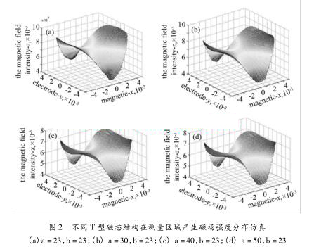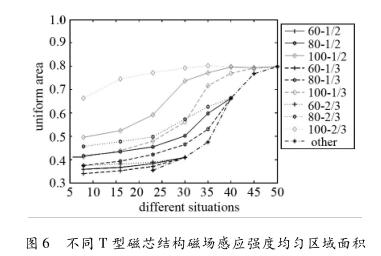 仿真實(shí)驗(yàn)證明在有限的空間下,修改T磁芯的不同參數(shù),可以增加流量計(jì)測量區(qū)域內(nèi)部的磁場分布情況,也可以適當(dāng)?shù)恼{(diào)整流量計(jì)測量區(qū)域中的磁場強(qiáng)度與均勻度,根據(jù)生產(chǎn)測井中的實(shí)際工況,改變井水流量計(jì)的T磁芯參數(shù)獲得設(shè)計(jì)參數(shù)。