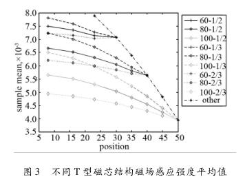 如圖3所示為不同T型磁芯結(jié)構(gòu)下測量區(qū)域產(chǎn)生磁場感應(yīng)強(qiáng)度平均值,圖中橫坐標(biāo)為T型磁芯b的角度,縱坐標(biāo)為測量區(qū)域的平均磁場強(qiáng)度,圖標(biāo)表示的是T型磁芯的不同a的角度以及磁芯長端寬度所占的比例。其中以“角度-比例”表示,例如30-1/2表示T型磁芯的較長端角度a為30°,k1/(k1+k2)為1/2時(shí)的測量區(qū)域中平均磁場強(qiáng)度測量結(jié)果。圖標(biāo)Other為T型磁芯較長端的角度a與較短端的角度b相等(即為23,30,35,40,45,50)時(shí)的流量計(jì)測量區(qū)域中的平均磁場強(qiáng)度。從仿真結(jié)果可以看出:T型磁芯的較長端的角度a越小,流量計(jì)測量區(qū)域中平均磁場強(qiáng)度越大;在T型磁芯的較長端的角度a一定時(shí),T型磁芯的較短端的角度b越小,流量計(jì)測量區(qū)域中平均磁場強(qiáng)度越大;在T型磁芯的較長端的角度a與較短端的角度b一定時(shí),T型磁芯的k1/(k1 + k2)越小,在流量計(jì)測量區(qū)域中平均磁場強(qiáng)度越大。