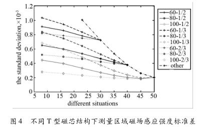 如圖4所示為不同T型磁芯結(jié)構(gòu)下測量區(qū)域產(chǎn)生磁場感應(yīng)強(qiáng)度標(biāo)準(zhǔn)差,圖中橫坐標(biāo)為T型磁芯b的角度,縱坐標(biāo)為測量區(qū)域磁場強(qiáng)度的標(biāo)準(zhǔn)差,圖標(biāo)圖例與圖3中一致。從仿真結(jié)果可以看出:T型磁芯的較長端的角度a越小,流量計(jì)測量區(qū)域中磁場強(qiáng)度標(biāo)準(zhǔn)差越大;在T型磁芯的較長端的角度a一定時(shí),T型磁芯的較短端的角度b越小,流量計(jì)測量區(qū)域中磁場強(qiáng)度標(biāo)準(zhǔn)差越大;在T型磁芯的較長端的角度a與較短端的角度b一定時(shí),T型磁芯的k1/(k1 + k2)越小,在流量計(jì)測量區(qū)域中磁場強(qiáng)度標(biāo)準(zhǔn)差越大。