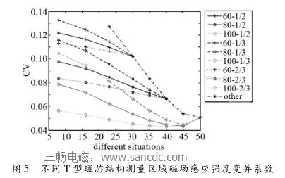 標(biāo)準(zhǔn)差代表磁場測量區(qū)域的磁場分布波動(dòng)性較大,因而需引入變異系數(shù)對測量區(qū)域中的磁場分布情況進(jìn)一步分析。如圖5所示為不同T型磁芯結(jié)構(gòu)下測量區(qū)域磁場感應(yīng)強(qiáng)度變異系數(shù),圖中橫坐標(biāo)為T型磁芯b的角度,縱坐標(biāo)為測量區(qū)域磁場強(qiáng)度分布的變異系數(shù),圖標(biāo)圖例與圖3中一致。從仿真結(jié)果可以看出:T型磁芯的較長端的角度a越小,流量計(jì)測量區(qū)域中磁場強(qiáng)度變異系數(shù)越大;在T型磁芯的較長端的角度a一定時(shí),T型磁芯的較短端的角度b越小,流量計(jì)測量區(qū)域中磁場強(qiáng)度變異系數(shù)越大;在T型磁芯的較長端的角度a與較短端的角度b一定時(shí),T型磁芯的k1/(k1 + k2)越小,在流量計(jì)測量區(qū)域中磁場強(qiáng)度變異系數(shù)越大。異系數(shù)越大說明磁場分布越不均勻,波動(dòng)性越大;異系數(shù)越小說明磁場分布趨向均勻。下面通過計(jì)算測量區(qū)域中的磁場均勻區(qū)域來對這一結(jié)果進(jìn)一步的分析。