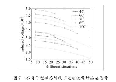 從仿真結(jié)果可以看出:T型磁芯的較長端的角度a越小,流量計(jì)電極兩端獲得的感應(yīng)信號(hào)越大;在T型磁芯的較長端的角度a一定時(shí),T型磁芯的較短端的角度b越小,流量計(jì)電極兩端獲得的感應(yīng)信號(hào)越大。這主要是因?yàn)?strong>井水流量計(jì)勵(lì)磁線圈的增加,使得流量計(jì)測量區(qū)域的磁場強(qiáng)度增加,同樣分布的流速下使得流量計(jì)電極兩端的感應(yīng)信號(hào)增加。