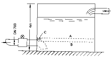 案例4 廣西某水廠在郊區(qū)山頭設置清水池,利用水池高度勢能發(fā)送成品水。運行人員反映計量出水量的DN700mm酸堿污水流量計有時候流量顯示不穩(wěn)?;蝿舆_百分之十幾到百分之二十,誤差也大,估計相差約20%?,F(xiàn)場考查發(fā)現(xiàn)水池如圖7-9所示安裝流量傳感器,水位高度不足就會卷入氣泡,甚至流量傳感器測量管內不能充滿。如水位降至A線時,雖高出吸入口頂端,但高出不多,還會在C處產生旋渦,將水位表面空氣卷入形成氣泡,使顯示晃動;若水位降到B,測量管將不滿管。我們建議如圖虛線所示裝一彎頭,擴大水池有效容量,減少吸入氣泡的機會,彌補原設計的不足。這類實例是經常遇到的。